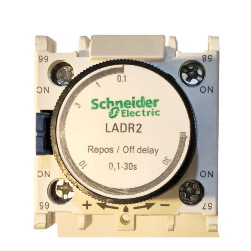 تایمر کنتاکتور LADR2 تاخیر در قطع تا 30 ثانیه که این تایمر صنعتی کنتاکتور زمان تاخیر تنظیم شده را محاسبه کرده و در زمان مشخص کنتاکتور را به حالت خاموش در می اورد که تایمر تاخیر در قطع تولید الودگی صوتی ندارد و با اصطحلاک پایین کارامد بوده است . تایمر صنعتی کنتاکتور تاخیر در قطع استاندارد در گروه صنعتی اشنایدر 110 لاله زار توزیع می شود .