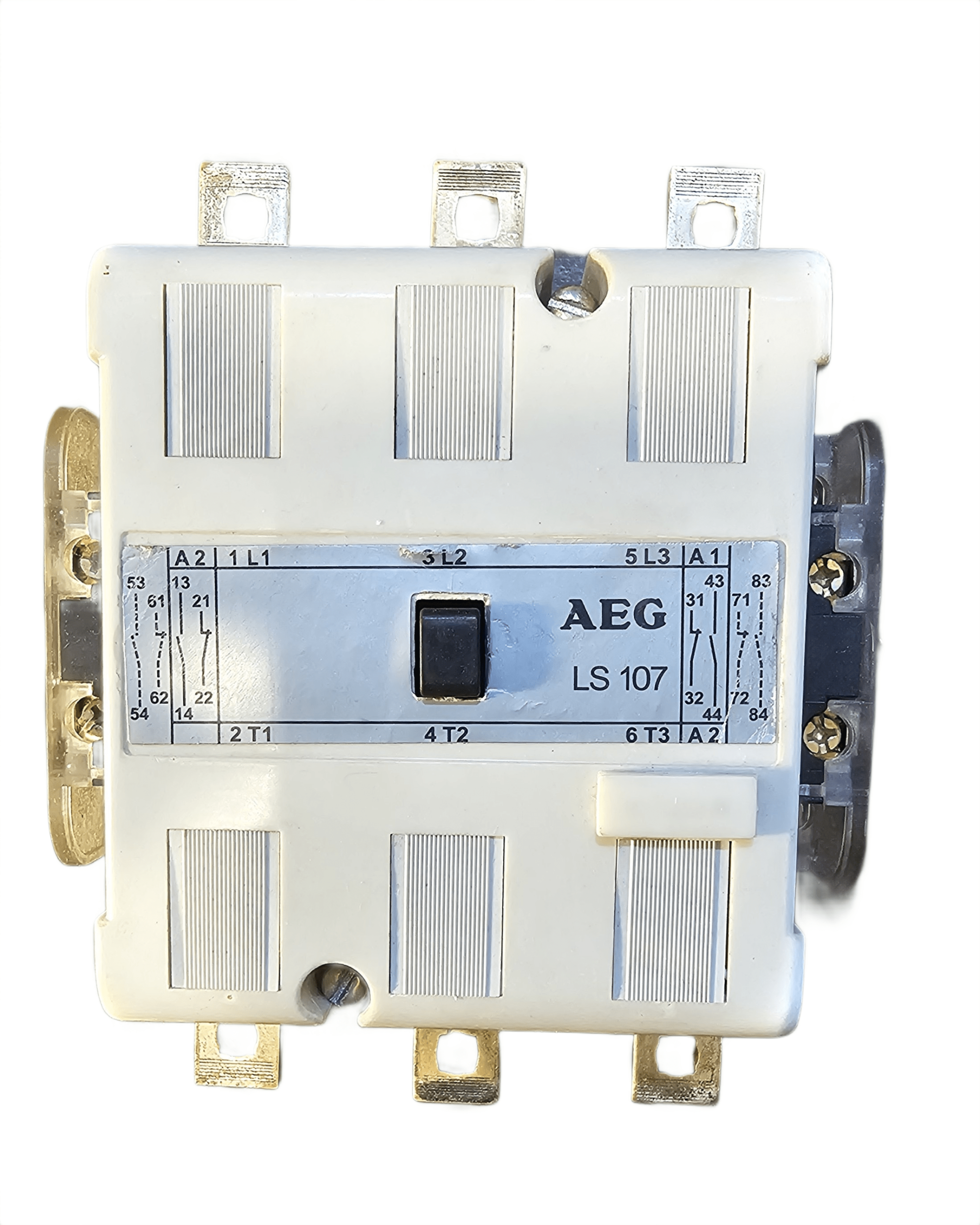 کنتاکتور LS 107 AEG قدیم که یک کنتاکتور سه فاز شمش خور بوده با بوبین 220 ولت برق شهری که این کنتاکتور ااگ المانی با پلاتین های تولید شده از نقطه نقره دار و پایه پلاتین از فلز مس ساخته شده و بدنه کنتاکتور ااگ المانی 107 از مواد پلی امید ضد حرارت غیر مستقیم طراحی شده و شمش های کنتاکتور از الیاژ مس بوده و مغزی کنتاکتور از فلز ابکاری شده ضد خوردگی و ضد روطوبت می باشد و این کنتاکتور وزن سنگینی داشته به علت استفاده کردن از مواد اولیه درجه 1 در ساخت کنتاکتور LS 107 AEG بوده که در نوع خود بینظیر می باشد و حرفه ای در کارهای سخت با اصطحلاک پایین بوده است .